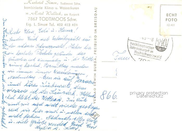73292857 alte Postkarte Todtmoos Kurhotel-Simon Hotel-Waldeck postalisch gelaufen Erhaltung siehe scans [LiesaD40] KatCode: 11110008337108