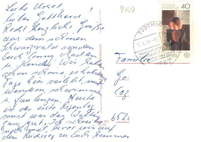 73928601 Todtmoos Schwarzwald BW Hauptstr Rathausplatz Wallfahrtskirche Trachten Au Schwarzenbach Hintertodtmoos Strick Ruette Freibad Kurpark Weg postalisch gelaufen Erhaltung siehe scans [WerneD78] alte Postkarte Wern Katcode 11110008337108