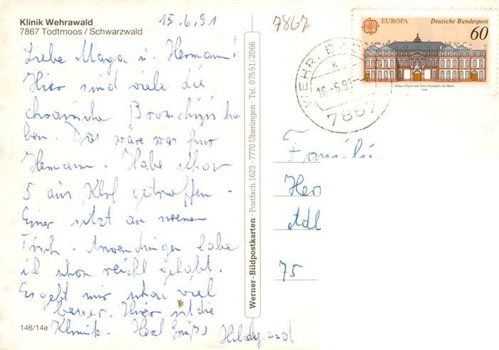 73928289 Todtmoos Schwarzwald BW Klinik Wehrawald postalisch gelaufen Erhaltung siehe scans [WerneD78] alte Postkarte Wern Katcode 11110008337108