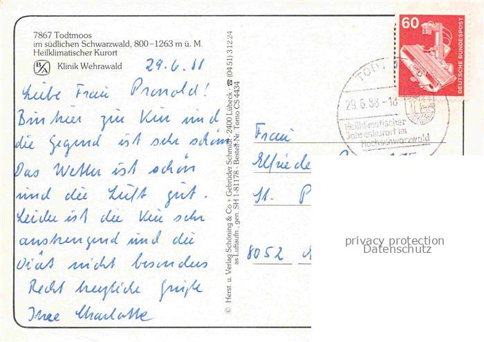 Todtmoos Schwarzwald BW Klinik Wehrawald Fliegeraufnahme postalisch gelaufen Erhaltung siehe scans [WerneD78] alte Postkarte Wern Katcode 11110008337108