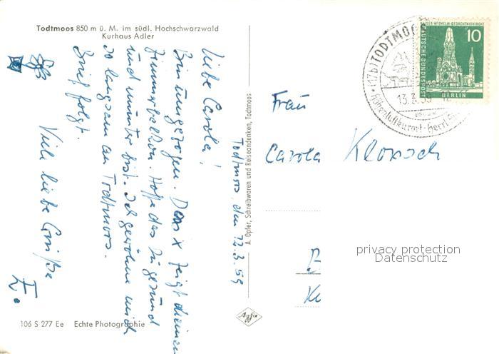73685983 Todtmoos Schwarzwald BW Kurhaus Adler postalisch gelaufen Erhaltung siehe scans [WerneD78] alte Postkarte Wern Katcode 11110008337108