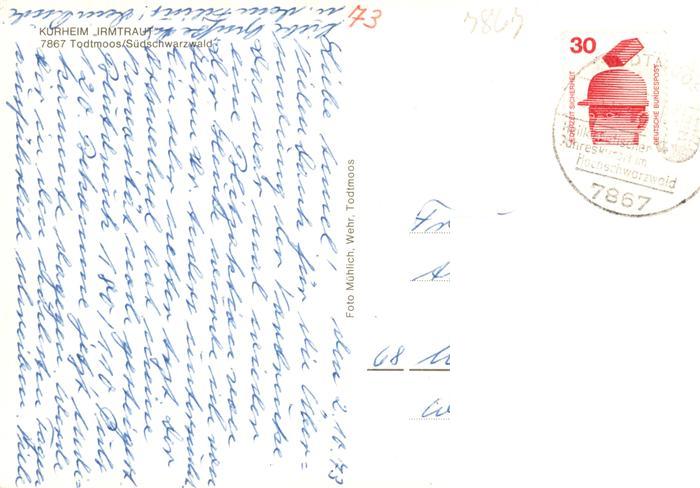 73927601 Todtmoos Schwarzwald BW Kurheim Irmtraud postalisch gelaufen Erhaltung siehe scans [WerneD78] alte Postkarte Wern Katcode 11110008337108