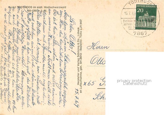 73704414 Todtmoos Schwarzwald BW Kurort im Schwarzwald postalisch gelaufen Fliegeraufnahme Erhaltung siehe scans [FriedD77] Fliegeraufnahme alte Postkarte Frie Katcode 11110008337108
