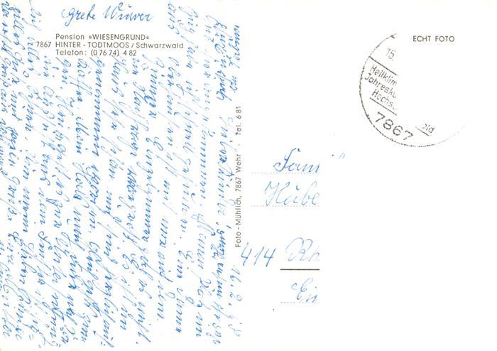 73921035 Todtmoos Schwarzwald BW Pension Wiesengrund postalisch gelaufen Erhaltung siehe scans [WerneD78] alte Postkarte Wern Katcode 11110008337108