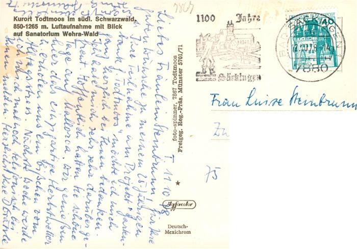 73935018 Todtmoos Schwarzwald BW Sanatorium Wehra Wald Fliegeraufnahme postalisch gelaufen Erhaltung siehe scans [WerneD78] alte Postkarte Wern Katcode 11110008337108