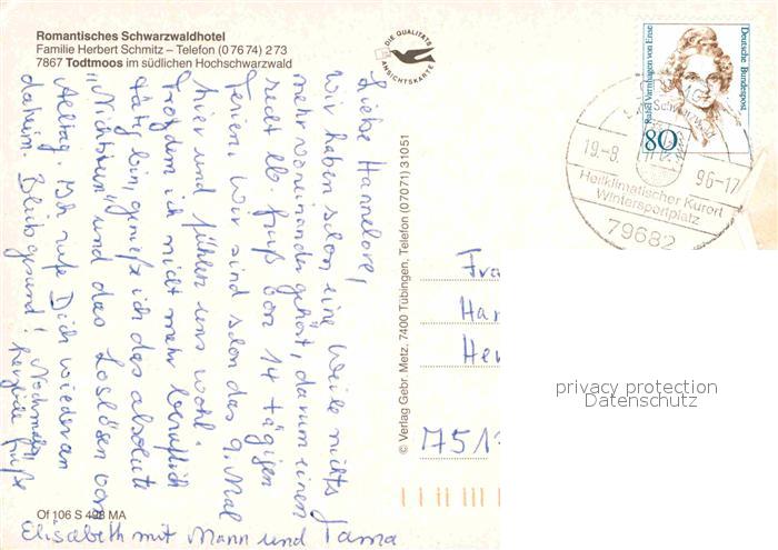 72819649 alte Postkarte Todtmoos Schwarzwald BW Schwarzwaldhotel postalisch gelaufen Erhaltung siehe scans [NatalD47] KatCode: 11110008337108