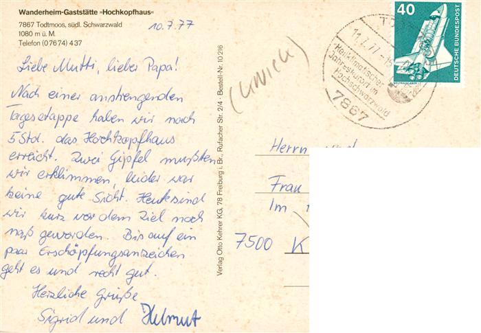 73935010 Todtmoos Schwarzwald BW Wanderheim Gaststaette Hochkopfhaus postalisch gelaufen Erhaltung siehe scans [WerneD78] alte Postkarte Wern Katcode 11110008337108