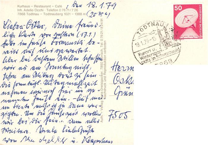 73927603 Todtnau Schwarzwald BW Kurhaus Restaurant Cafe postalisch gelaufen Erhaltung siehe scans [WerneD78] alte Postkarte Wern Katcode 11110008336087