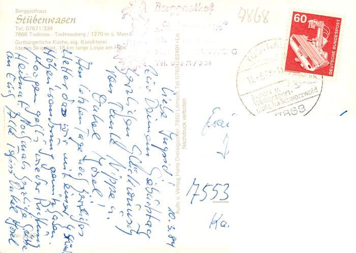 73927866 Todtnauberg Schwarzwald BW Berggasthaus Stuebenwasen Gaststube Feldberggebiet postalisch gelaufen Erhaltung siehe scans [WerneD78] alte Postkarte Wern Katcode 11110008336087