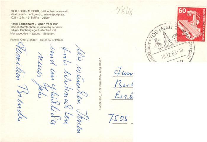 73927405 Todtnauberg Schwarzwald BW Hotel Haus Sonnenalm postalisch gelaufen Erhaltung siehe scans [WerneD78] alte Postkarte Wern Katcode 11110008336087
