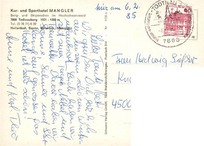 73924960 Todtnauberg Schwarzwald BW Kur und Sporthotel Mangler postalisch gelaufen Erhaltung siehe scans [WerneD78] alte Postkarte Wern Katcode 11110008336087