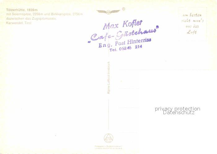 72752576 Toelzerhuette mit Soiernspitze Birkkarspitze Zugspitzmassiv postalisch nicht gelaufen Erhaltung siehe scans [LiesaD40] KatCode: 11390335070936