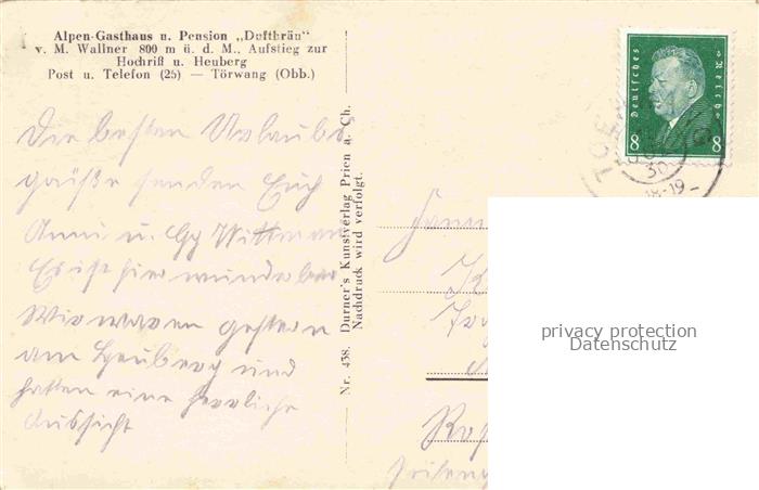 74008853 alte Postkarte Toerwang Samerberg Rosenheim Bayern Alpengasthaus Pension Duftbraeu Aufstieg zur Hochriss und Heuberg postalisch gelaufen Erhaltung siehe scans [FriedD77] KatCode: 11110009187172