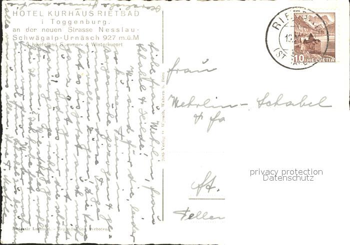 11624576 alte Postkarte Toggenburg Fliegeraufnahme Hotel Kurhaus Rietbad postalisch gelaufen Erhaltung siehe scans KatCode: 11470190585844