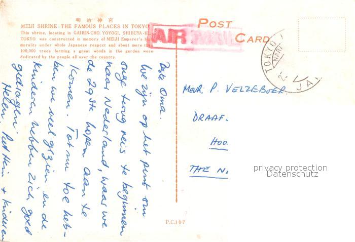 alte Postkarte Tokyo Meiji Shrine postalisch gelaufen Erhaltung siehe scans [WerneD78]