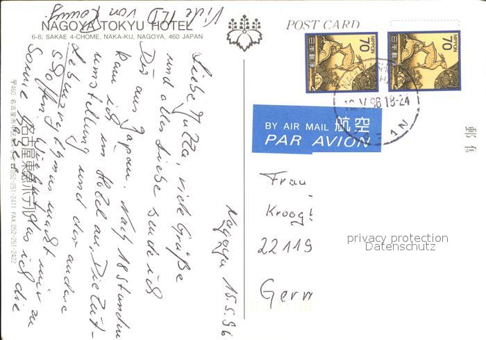 old postcard Tokyo Nagoya Tokyu Hotel postalisch gelaufen Erhaltung siehe scans