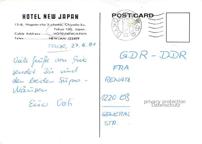 74096419 old postcard Tokyo TOKIO Japan Hotel New Japan postalisch gelaufen Erhaltung siehe scans [WerneD78] KatCode: 12050