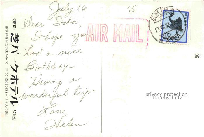 74005969 old postcard Tokyo TOKIO Japan Shiba Park Hotel postalisch gelaufen Erhaltung siehe scans [WerneD78] KatCode: 12050