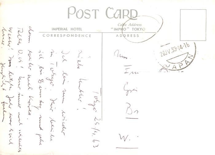 old postcard Tokyo Tokio JP Imperial Hotel postalisch gelaufen Erhaltung siehe scans [WerneD78]