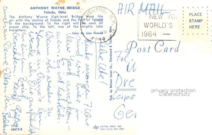 73706926 old postcard Toledo Ohio Anthony Wayne Bridge Air view postalisch gelaufen Erhaltung siehe scans [WerneD78] KatCode: 14140370000000
