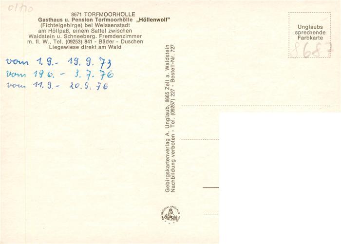 73891648 Torfmoorhoelle Weissenstadt Gasthaus Pension Torfmoorhoelle Hoellenwolf Gastraeume postalisch nicht gelaufen Erhaltung siehe scans [FriedD77] KatCode: 11110009479166