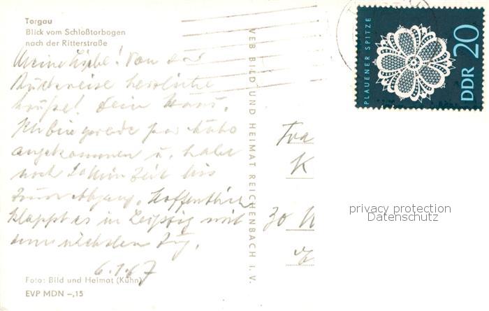73835063 alte Postkarte Torgau Blick vom Schlosstorbogen auf die Ritterstrasse postalisch gelaufen Erhaltung siehe scans [WerneD78] KatCode: 11110014389320