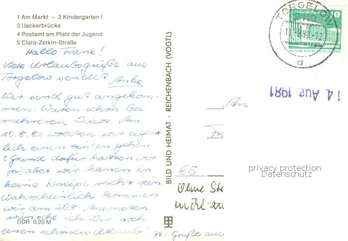 73753668 alte Postkarte Torgelow Am Markt Kindergarten Ueckerbruecke Postamt am Platz der Jugend Clara Zetkin Strasse postalisch gelaufen Erhaltung siehe scans [FriedD77] KatCode: 11110013062058