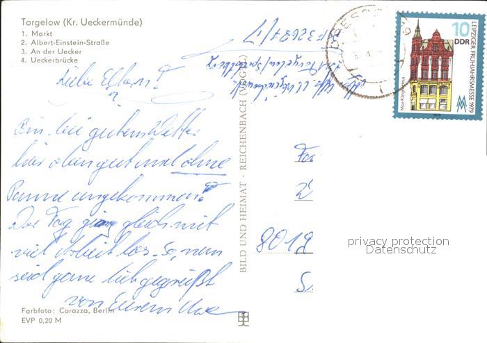 72382910 alte Postkarte Torgelow Markt Albert Einstein Strasse Ueckerbruecke postalisch gelaufen Erhaltung siehe scans KatCode: 11110013062058
