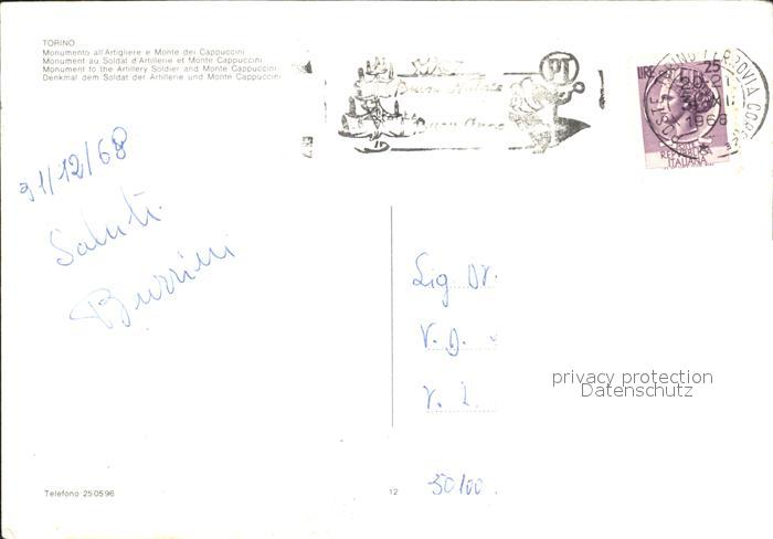 old postcard Torino Denkmal Artillerie Monte Cappucinni postalisch gelaufen Erhaltung siehe scans