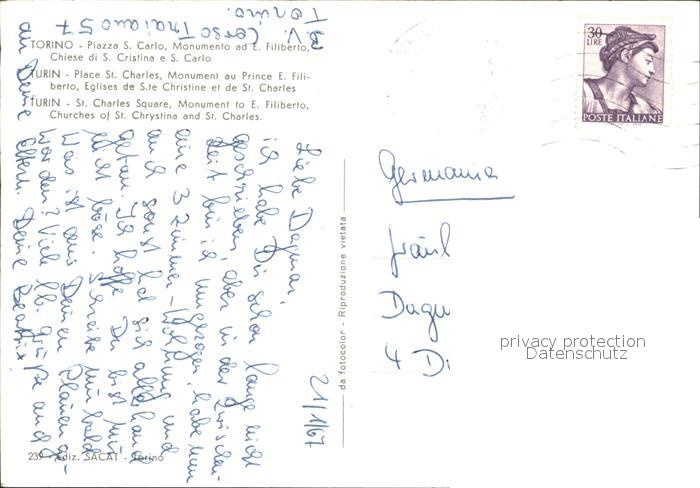 old postcard Torino Piazza San Carlo Monumento ad E Filiberto Chiese di S Cristina e S Carlo postalisch gelaufen Erhaltung siehe scans
