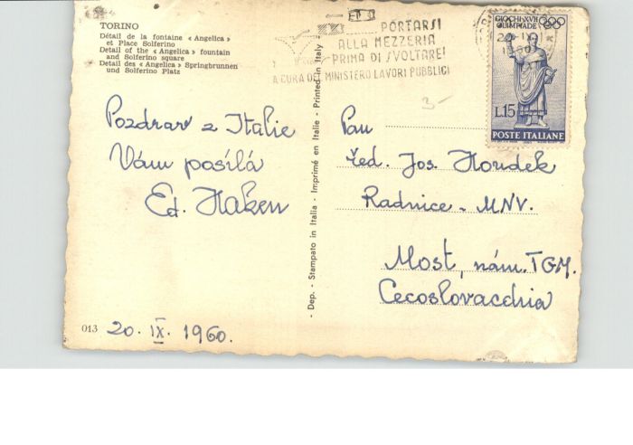 old postcard Torino Strassenbahn Piazza Solferino Fontana Angelica postalisch gelaufen