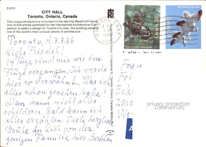 old postcard Toronto Canada City Hall postalisch gelaufen Erhaltung siehe scans