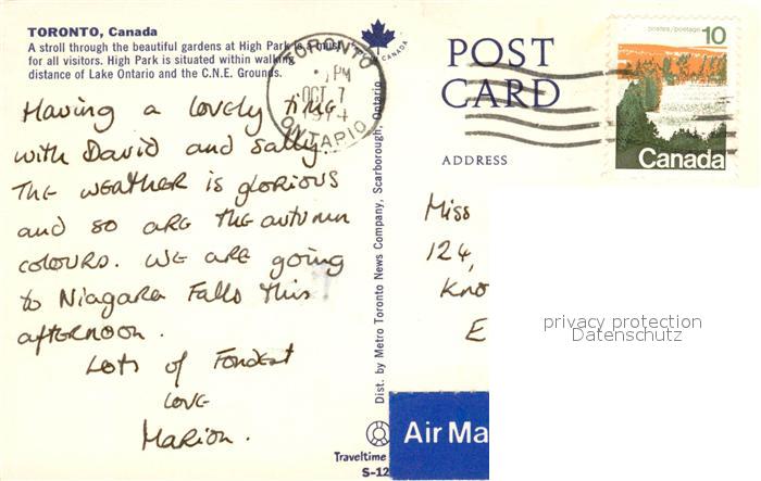 old postcard Toronto Canada High Park postalisch gelaufen Erhaltung siehe scans [WerneD78]