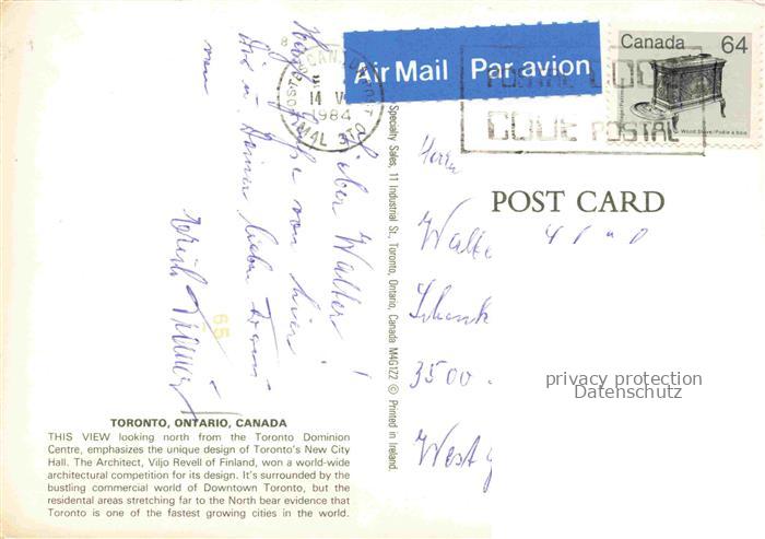 74091669 old postcard TORONTO Canada Ontario Dominion Centre postalisch gelaufen Erhaltung siehe scans [IrynaD87] KatCode: 14110