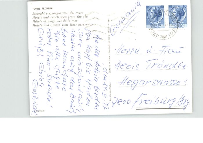 old postcard Torre Pedrera Alberghi Spiaggia Mare Strand postalisch gelaufen