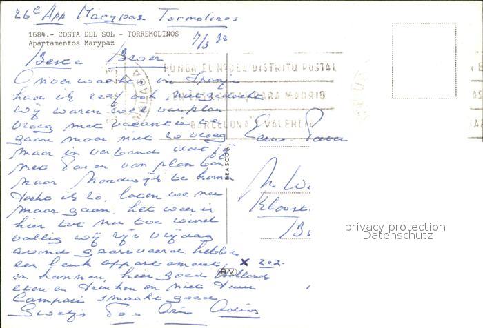 old postcard Torremolinos Apartamentos Marypaz postalisch gelaufen Erhaltung siehe scans
