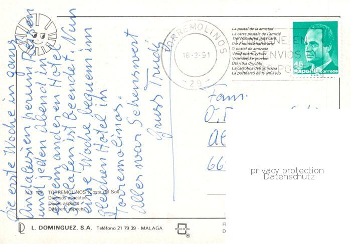 old postcard Torremolinos ES Fliegeraufnahmen Strandpartien Palmenallee Ortsansicht postalisch gelaufen Erhaltung siehe scans [WerneD78]