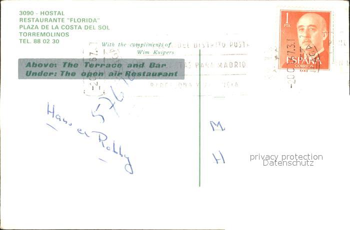 old postcard Torremolinos Hostal Restaurante Florida postalisch gelaufen Erhaltung siehe scans