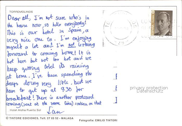 old postcard Torremolinos Hotel Aloha Puerto Sol postalisch gelaufen Erhaltung siehe scans