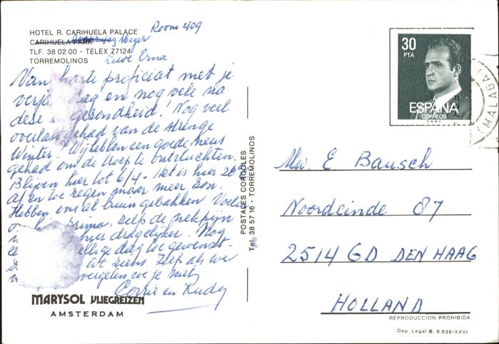 old postcard Torremolinos Hotel Carihuela Palace Swimming Pool postalisch gelaufen Erhaltung siehe scans