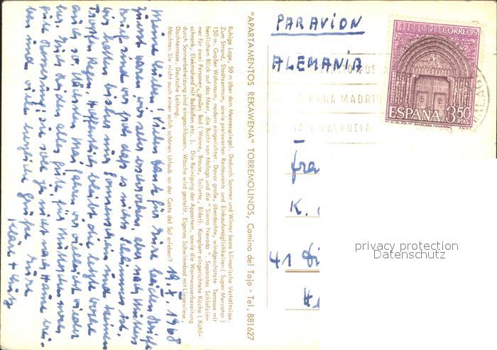 old postcard Torremolinos Recuerdo de Apartamentos Rekawena postalisch gelaufen Erhaltung siehe scans