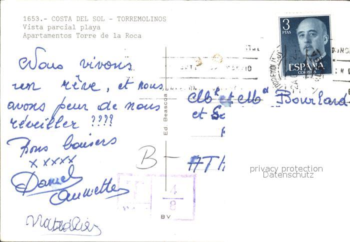 old postcard Torremolinos Vista parcial playa Apartamentos Torre de la Roca postalisch gelaufen Erhaltung siehe scans