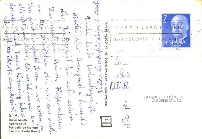 old postcard Torroella de Montgri S.A.V. Dieter Mueller Apartado 41 Urbanizacion Maspinell Marisal postalisch gelaufen Erhaltung siehe scans