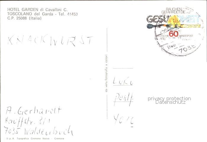 old postcard Toscolano Maderno Lago di Garda Hotel Garden di Cavallini postalisch gelaufen Erhaltung siehe scans