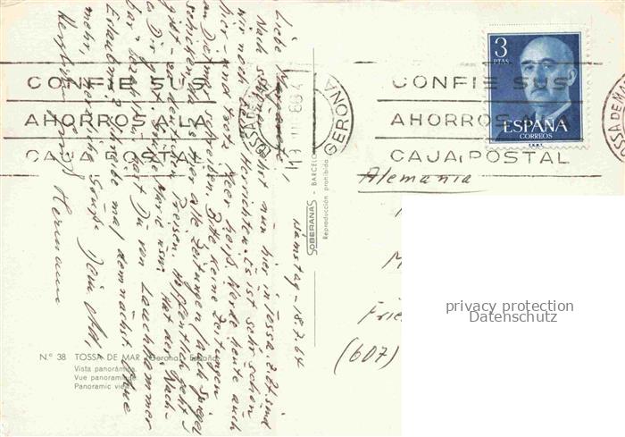 74156323 old postcard TOssA DE MAR Costa Brava Gerona ES Costa-Brava Kueste Felsen Meer Strand Burg Panorama Hotel Wappen postalisch gelaufen Fliegeraufnahme Erhaltung siehe scans [Karloger] KatCode: 11510