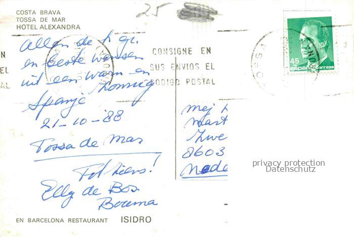 74156322 old postcard TOssA DE MAR Costa Brava Gerona ES Hotel-Alexandra Costa-Brava Burg Strand Kueste Meer Felsen Stadtansicht postalisch gelaufen Erhaltung siehe scans [Karloger] KatCode: 11510