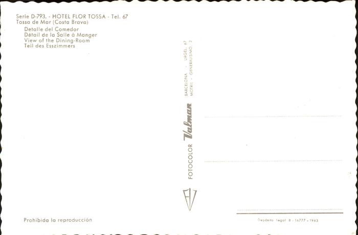 Tossa de Mar Hotel Flor Tossa Comedor postalisch nicht gelaufen Erhaltung siehe scans