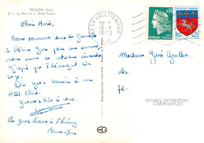 13846709 Toulon -sur-Mer 83 Var Le Port et le Mont Faron postalisch gelaufen Erhaltung siehe scans [FriedD77] carte postale Frie Katcode 11170083283137