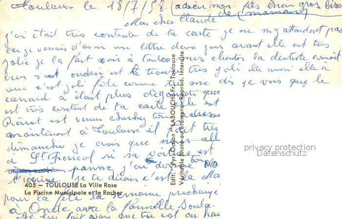 13541375 Toulouse Haute-Garonne Piscine Municipale a l Heure du bain et le Rocher postalisch nicht gelaufen Erhaltung siehe scans [FriedD77] KatCode: 11170031331555