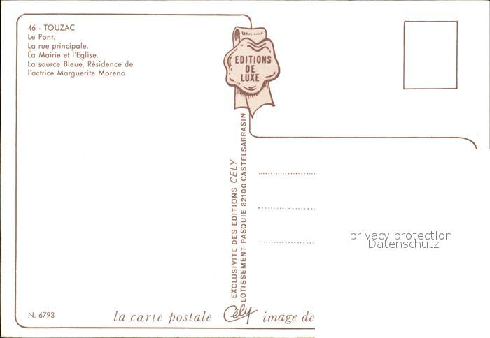 12429698 Touzac Lot Le Pont La rue principale La Mairie et l’Eglise La source Bleue Residende de l’actrice Marguerite Moreno postalisch nicht gelaufen Erhaltung siehe scans KatCode: 11170046146321